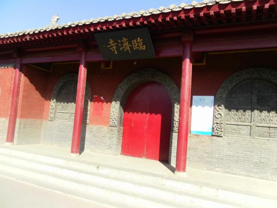 山门殿为歇山式灰筒瓦顶,面宽呈明五暗七形式,殿中央立“义玄禅师大型石刻画像碑”。此碑选用青田石料,由碑身和须弥座两部份组成,通高2.90米。碑身正面镌义玄禅师半身画像,系用白描手法,以阴线镌刻而成。像的左上方刻中国佛协赵朴初会长题写的《临济义玄禅师像赞》:“无相示相,後人标榜。黄檗山头,滹沱河上。棒喝机锋,陶铸龙象。法流天下,千花竞放。”石碑背面刻《临济义玄禅师传略》,约800字,本宗法师撰。