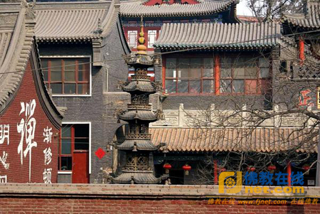 山门殿两翼是钟鼓楼,山门殿迎面是前殿,和东、西厢构成一个前院。前殿布局是十八罗汉朝观音。西厢旁有尊 泥塑“常八十”。所谓“常八十”,就是有人问他多大年纪,他总是说八十岁,再过十年问他,还是八十岁,因此“常八十”叫开了,反把他的真名忘了。相传“常 八十”活了120岁,曾是李自成理发师。当初李自成劝他进京,他坚不相从,后来在此落发为僧。由于他济施贫困,免费行医,威望很高,因此圆寂后,人们为他 朔了这尊像,以示怀念。后院正中是大雄宝殿,东厢为大士殿,西厢为地藏殿。院内古木参天,环境清幽。其中的白皮松,高约30米,是珍稀树种。大雄宝殿的释 迦牟尼佛,双目微睁,面相慈祥,踟趺坐在莲花上,显得格外庄严肃穆。《山西通志》又载:“雍正九年(1731年)僧了然重修建毗卢阁。”此阁在大雄宝殿的 后面,分为两层,由于上层供毗卢佛而得名。《山西通志》载:“康熙丙寅二十五年(1686年),都司(官名)陆君兴建藏经阁五楹,四十六年(康熙)僧平山 重修。”此阁也是两层,于1959年1月毁于火。
