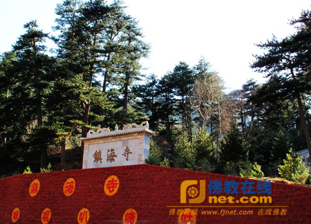 镇海寺位于台怀镇南清水河西侧,距台怀镇5公里,坐落在“二龙戏珠”的风水宝地,左右两侧环绕的山峰,犹 如两条飞龙落下河谷,拱背弯腰,腾挪围抱;寺院建筑在两山合抱的一个石山嘴上,海拔1600米,宛若一颗二龙嬉戏的宝珠。寺院因山借势,错落有致,从山腰 到山顶形成步步高升格局。山豁口处有苍老挺拔的大松树,走在松树林间的蹊径,再听飒飒的松风,给人一促静寞幽深的感觉。入寺四望,南侧的山峰,长满密密麻 麻的杉树和杨树,北侧的山巅上,千年古松出于(山免)岩石之中。