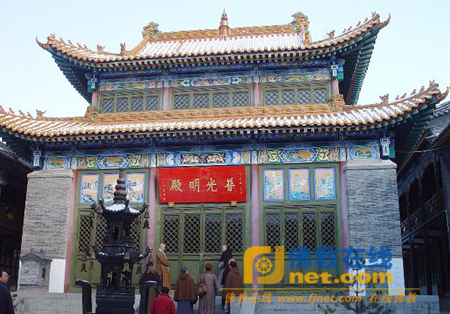 第三院为普光明殿院,正面为普光明殿,三开间,重檐歇山顶。内供木雕“西方三圣”,中为阿弥陀佛,右为观音菩萨,左为大势至菩萨。“西方三圣”面为供缅甸玉佛和带箭铜铸文殊像。东西配楼,计二十八间。
