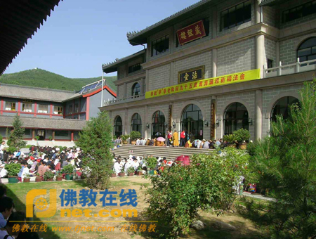 第四院为五观堂院,正面为二层楼房,上下各七间。一层为五观堂,是僧人食斋的地方。门旁联∶“有戒德,知惭愧,斗金易化;不学修,无行持,滴水难消”。二层为法堂,内置一排排蒲团,是僧众坐禅念佛的地方。东西配楼,计有二十八间。