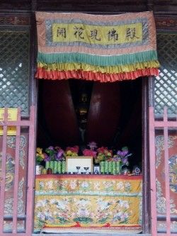 顺弯曲的夹墙石道来到山门前,门两旁的石狮,一雄一雌,硕大雄浑,威武壮猛。台怀中心区诸寺多雕有石狮,而唐代的遗作惟有此一处。山门里一共四重大殿。这第一重为天王殿,内塑四大天王,也称四大金刚,分别是抱琵琶的东方持国天王,持宝剑的南方增长大王,缠长蛇的西方广目天王,持雨伞的北方多闻天王,民间称他们为风(持剑者)、调 (抱瑟琶者)、雨(持伞者)、顺(握蛇者)四神。第二座殿为文殊殿,内供文殊菩萨,不同于一般青庙,这里的文殊菩萨面部为乳白色,而非贴金黄色,肩膀两边伸出了肩花,花上还放置了经书和智慧剑,文殊坐骑是卧在莲花上,而不是站立砖台。这些都体现了黄教文殊造像的特点。第三座为大佛殿,内供释迦牟尼佛 (人间婆娑世界)、药师佛(东方琉璃世界)、阿弥陀佛(西方极乐世界),合称“三世佛”。三世佛前为胁侍菩萨和供养菩萨。第四重殿里的“开花现佛”最具神秘色彩。殿内正中高竖一朵莲花,内含四尊佛像,有时八瓣莲花会缓缓绽开,现出四方阿弥佛。其实,这是巧设机关人工操作的结果。这大莲花与下面的大圆盘用通柱连在一起,当僧人在圆盘下的暗室驱动木轮,通柱即会转动,莲花随之开启或闭合,遂出现“开花现佛”景观。另外,在圆台上塑24个神像,称“二十四天”。