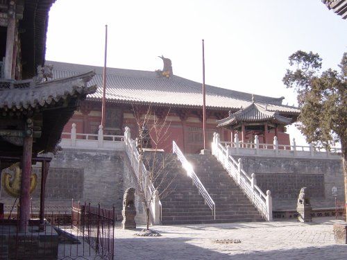 大雄宝殿矗立在4米多高的月台上。月台前正面置石级,周围装勾栏,四周巨相苍松,枝叶繁茂。大雄宝殿东向,面阔九间,53.75米;进深五间,29米,总面积为1559平方米,巍峨壮观,是中国规模最大的佛殿之一。