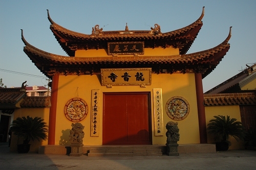 一九三七年住持惠明法师重建观音阁易名龙音寺,取其观音来此白龙现身之意。可叹时国难当前民不聊生,故虽有惠明法师携众发心,然所建寺院犹如茅蓬,占地仅一亩余。文革期间,龙音寺钟沉鼓寂梵音绝响。三十余年后,幸奉盛世政通人和,龙音寺得以重光。一九九五年老街规划改建,龙音寺迁至闵东路一号之民宅,占地与原寺相当。